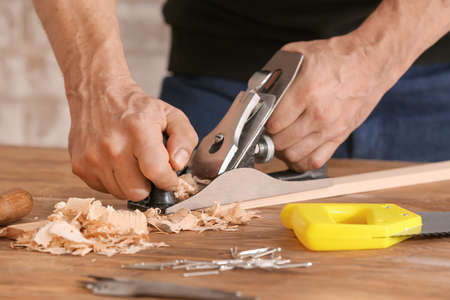 A man carpenter engaged in woodworking planes the surface of a wooden Board in his workshop with a hand plane. Concept of repair and construction.