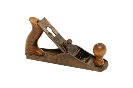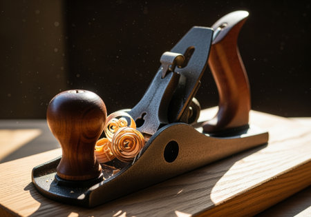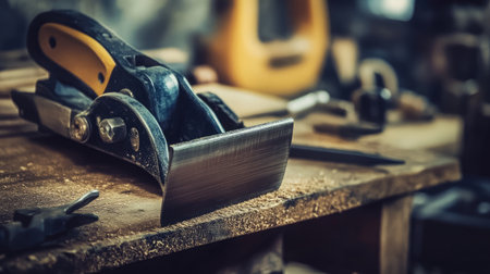 A close-up view of a vintage hand plane on a wooden workbench. This image captures the essence of woodworking, highlighting craftsmanship and the beauty of tools in a workshop filled with creativity.