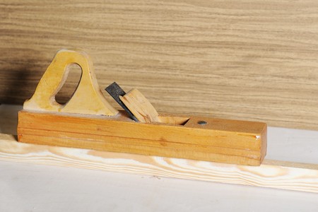 Joinery. Planing a natural wood furniture panel with a manual planer