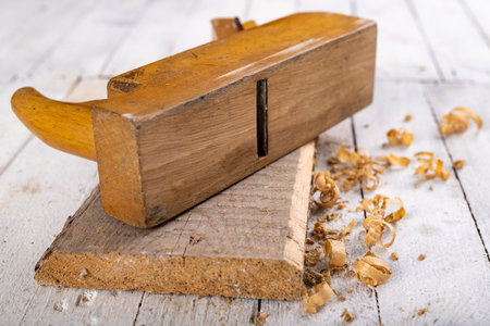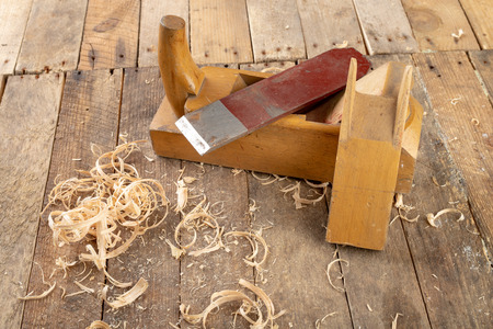 Wooden planer, table from old wood, a natural building material, handcrafted wood, ancient hand tools, carrying out carpentry, joinery tools, wood sawdust, old wood texture