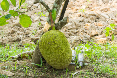 big jack fruit fall from tree on ground in nice blur background