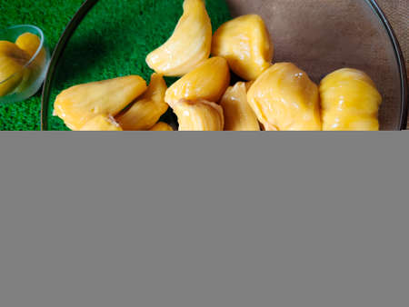 Fresh sweet jackfruit slices kept in glass plate and in glass bowl .Isolated on green background and gunny sack. Top view, Side view