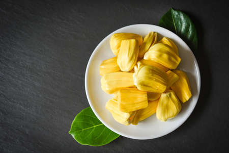 jackfruit on white plate on dark background, ripe jackfruit peeled tropical fruit fresh from jackfruit tree