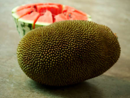 Jack fruit closeup behind blur watermelon on the shot for commercial use
