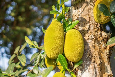 Group of fresh ripe jackfruit hanging on the tree harvest at orchard with nature bokeh background. It is a species of tree in the fig, mulberry, and breadfruit family. Selective focus on foreground.