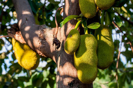 Jackfruit growing on tree. Tropical fruit of Thailand and Malaysia. Exotic healthy jack fruits on organic farm.