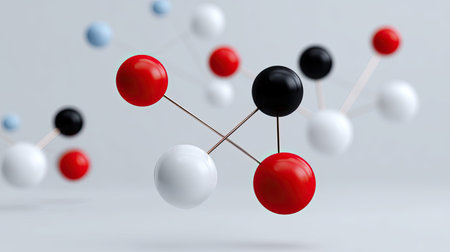 Abstract 3D rendering of a molecular structure with red, yellow, and blue spheres connected by black rods against a blurred light blue background