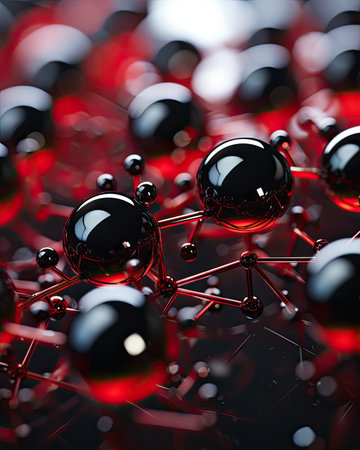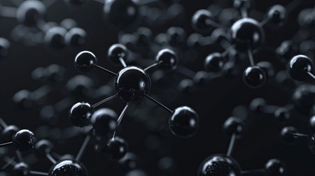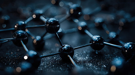 An image showcases a close-up of a molecular structure composed of dark spheres interconnected by lines. The composition has a shallow depth of field, with the focus on the central area, set against a dark textured background. Ideal for use in science, technology, and conceptual designs.