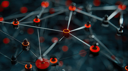 An abstract image showcases a network of interconnected nodes. The composition features sharp lines and blurred areas, while the color palette consists of dark and vibrant red accents. This image could be used in projects related to technology or data visualization, or as a creative background.