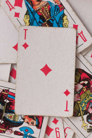 A closeup shot of a pile of playing cards on a white surface