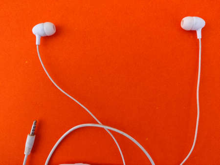 Copy space between two white ear buds isolated on orange background