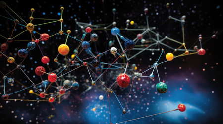 Abstract visual of colorful molecular structures showcasing connections between spheres, perfect for science, education, and technology themes.