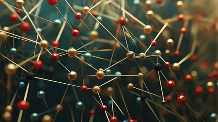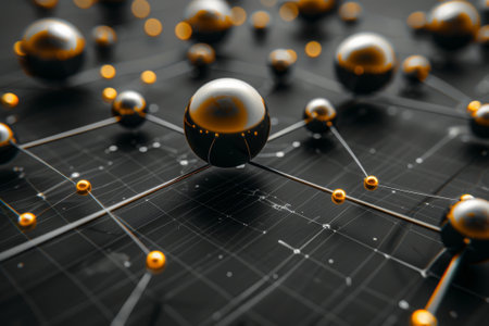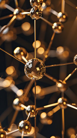 Golden spheres connected by thin lines create an abstract depiction of molecular structures on a dark surface.