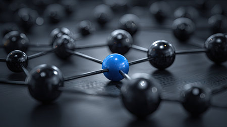 This image showcases an abstract network composed of interconnected spheres. The arrangement features a central blue sphere surrounded by dark gray spheres, linked by linear elements against a blurred background. The composition exhibits a modern and dynamic style, suggesting ideas of connection, communication, and technological advancement, suitable for various commercial applications.