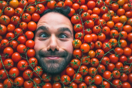 Man with tomatoes, concept for food industry. Face of emotional man in tomato surface