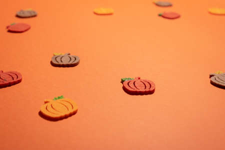 Felt pumpkins on orange desk close up with copy space