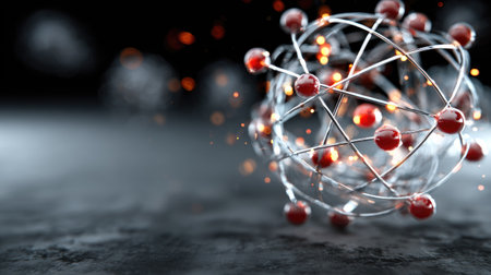 This abstract image showcases an atomic structure with glowing particles and intricate metallic wires. The dark background enhances the futuristic and scientific vibe, making it ideal for technology and research themes.