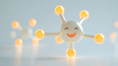 Glowing molecule with a happy face represents scientific discovery, chemical reactions, and innovative research