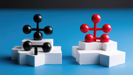 A striking composition featuring black and red abstract shapes arranged on white blocks on a vibrant blue background, perfect for showcasing creativity and modern design aesthetics.