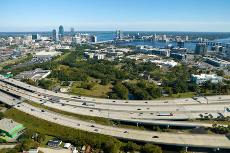 Aerial view of Jacksonville city with high office buildings and american freeway intersection with fast moving cars and trucks. USA transportation infrastructure concept