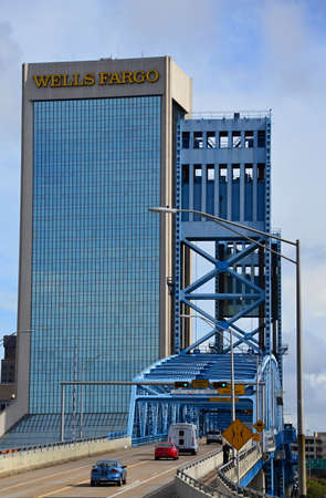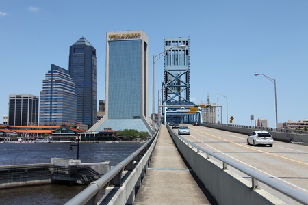 JACKSONVILLE, FLORIDA - FEBRUARY 16, 2016: Aerial city skyline on a sunny day. The city is a famous tourist attraction along the coast.