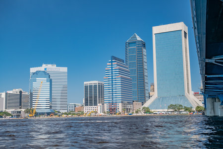 The skyline of the city of Jacksonville, Florida. Skyscrapers and offices of the business part of the city under the blue sky.