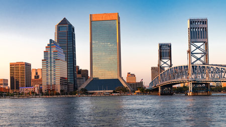 Jacksonville skyline features high-rise buildings and metal bridge. Captured during golden hour by the St. Johns River.
