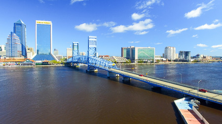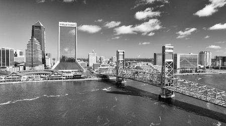 JACKSONVILLE, FLORIDA - FEBRUARY 16, 2016: Aerial city skyline on a sunny day. The city is a famous tourist attraction along the coast..