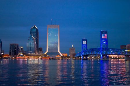 Night scene view of downtown Jacksonville on the water near the blue bridge.