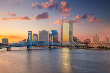 Jacksonville, Florida, USA. Cityscape image of Jacksonville, Florida with reflection of the city skyline in the water at beautiful sunset.