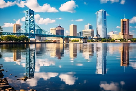 Blue sky reflected in the water of the bay in Jacksonville's business district. Bridge and modern business center buildings