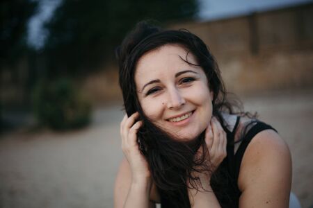 Portrait of a pretty girl with long red hair on a blurred background. Woman portrait without retouching with her natural imperfections