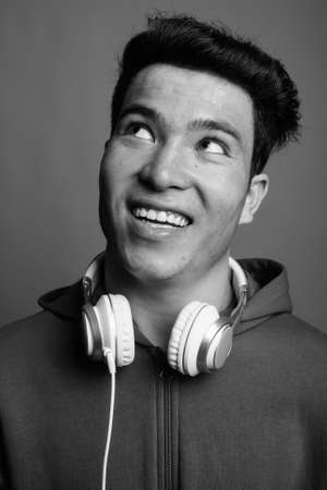 Portrait of a handsome young man in gray sweater. Studio shot.