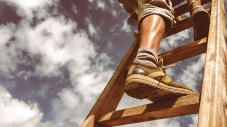 Close-up view of a person's legs and feet ascending a wooden ladder against a backdrop of a partly cloudy sky. The focus is on the feet, shoes, and ladder, with the sky and clouds as a secondary element.