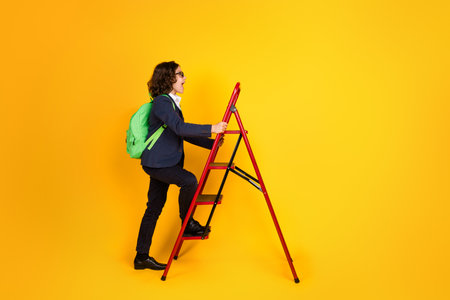 Full length photo of small schoolboy climb up ladder achievement dressed stylish uniform isolated on yellow color background