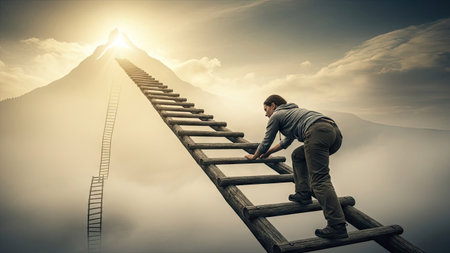 A person ascends a wooden ladder towards a mountain peak, bathed in ethereal light. The image features a cloudy sky and suggestive mountain setting. The composition uses a perspective view. The scene suggests concepts of achievement and progress, suitable for various editorial and commercial applications.