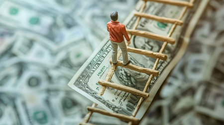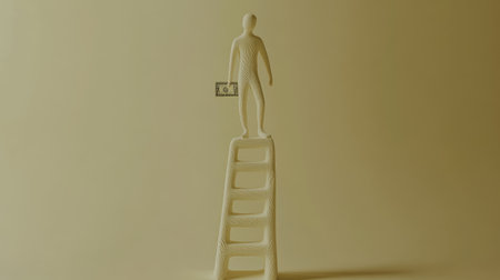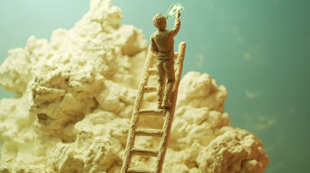 Clay figure, AI-modeled, ascending a ladder toward monetary success, with currency at the top, symbolizing growth and progress