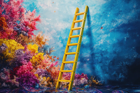 A yellow ladder is leaning against a wall in a colorful underwater scene. The ladder is the only object in the scene, and it is the focal point of the image