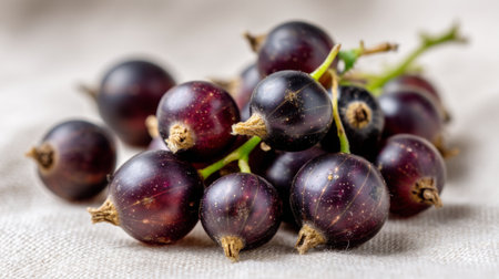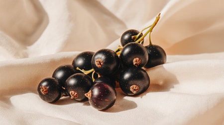 A beautiful arrangement of black currants resting on soft beige fabric, highlighting their round shape and glossy texture, perfect for food photography and healthy lifestyle themes.