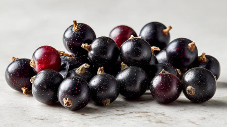 A beautiful arrangement of fresh black currants on a marble surface, highlighting their vibrant color and rich texture, perfect for food photography and healthy lifestyle themes.