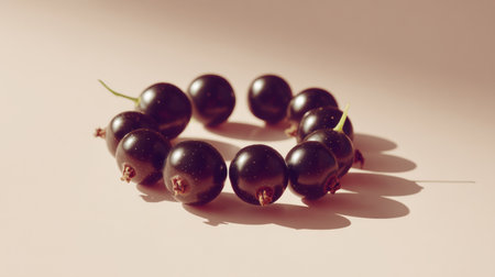 A circle of fresh blackcurrants arranged elegantly on a soft light background. The glossy texture and rich color highlight freshness, perfect for culinary projects.