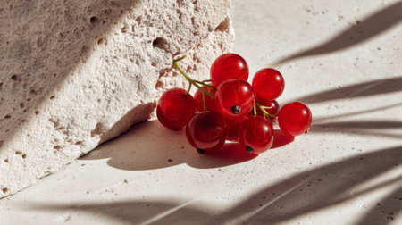 A cluster of fresh red currants resting on a textured stone surface. This artistic composition highlights the vibrant color and organic beauty of the berries.