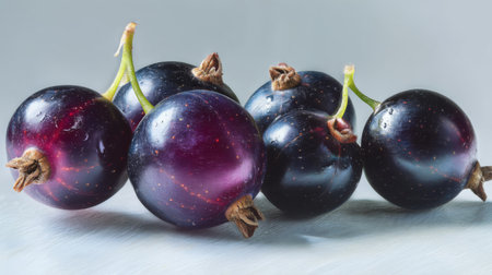 Discover the delectable beauty of fresh black currants, showcasing their rich color and texture against a soft gray background. Perfect for healthy recipes.