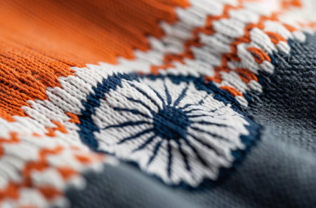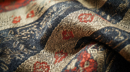 This captivating close-up image showcases intricate textures and vibrant colors in traditional textiles, highlighting exceptional craftsmanship and artistry.
