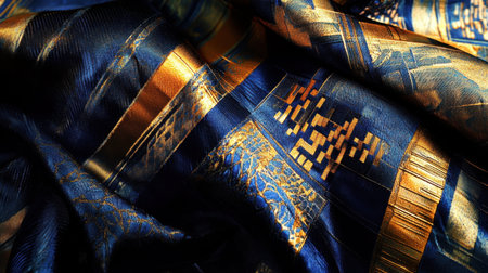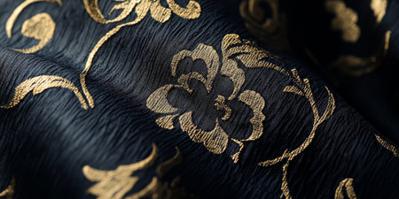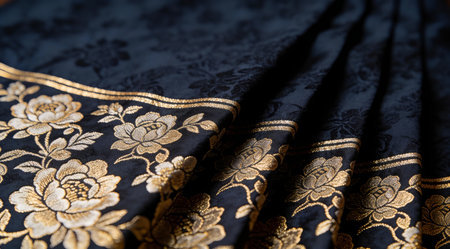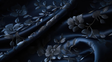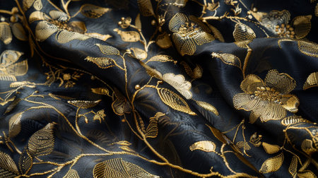 Luxurious digital textile illustration featuring intricate brocade styling, deep navy-black tones, shimmering gold threads, and softly draped folds under subtle low-key lighting. Perfect for premium fashion fabrics, upscale interior decor, elegant packaging designs, and sophisticated branding graphics. Evokes opulence, refinement, and timeless grandeur for lu... AI-generated digital illustration. AI-generated illustration.