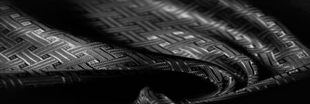 Black textile with beautiful white ornament on wooden .