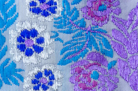 Close-up of intricate blue and white embroidery pattern on textured fabric surface.