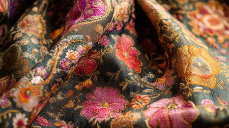 Vibrant multicolored fabric with ornate floral patterns and detailed textures. That the image is generated using AI.