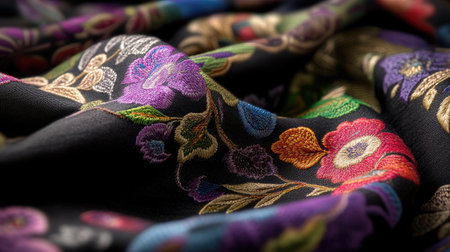 A stunning close-up of an elegant floral textile showcasing intricate embroidery and vibrant colors. Ideal for fashion or decor inspiration.