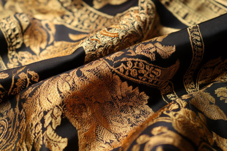 Luxurious Black and Gold Brocade Fabric Close-Up A detailed macro shot of intricate black and gold brocade fabric, with ornate